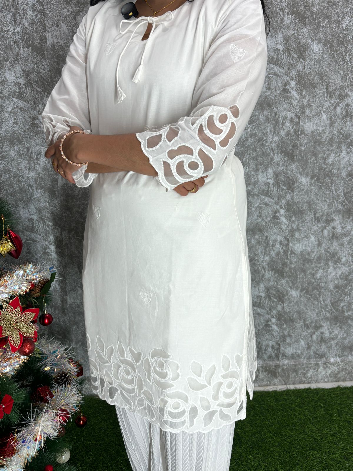 Elegant applique work kurti crafted with fine detailing and a graceful borders. Featuring intricate handcrafted designs, soft breathable fabric, and a comfortable fit. Perfect for casual outings, festive gatherings, or office wear, this kurti blends traditional artistry with modern style effortlessly.