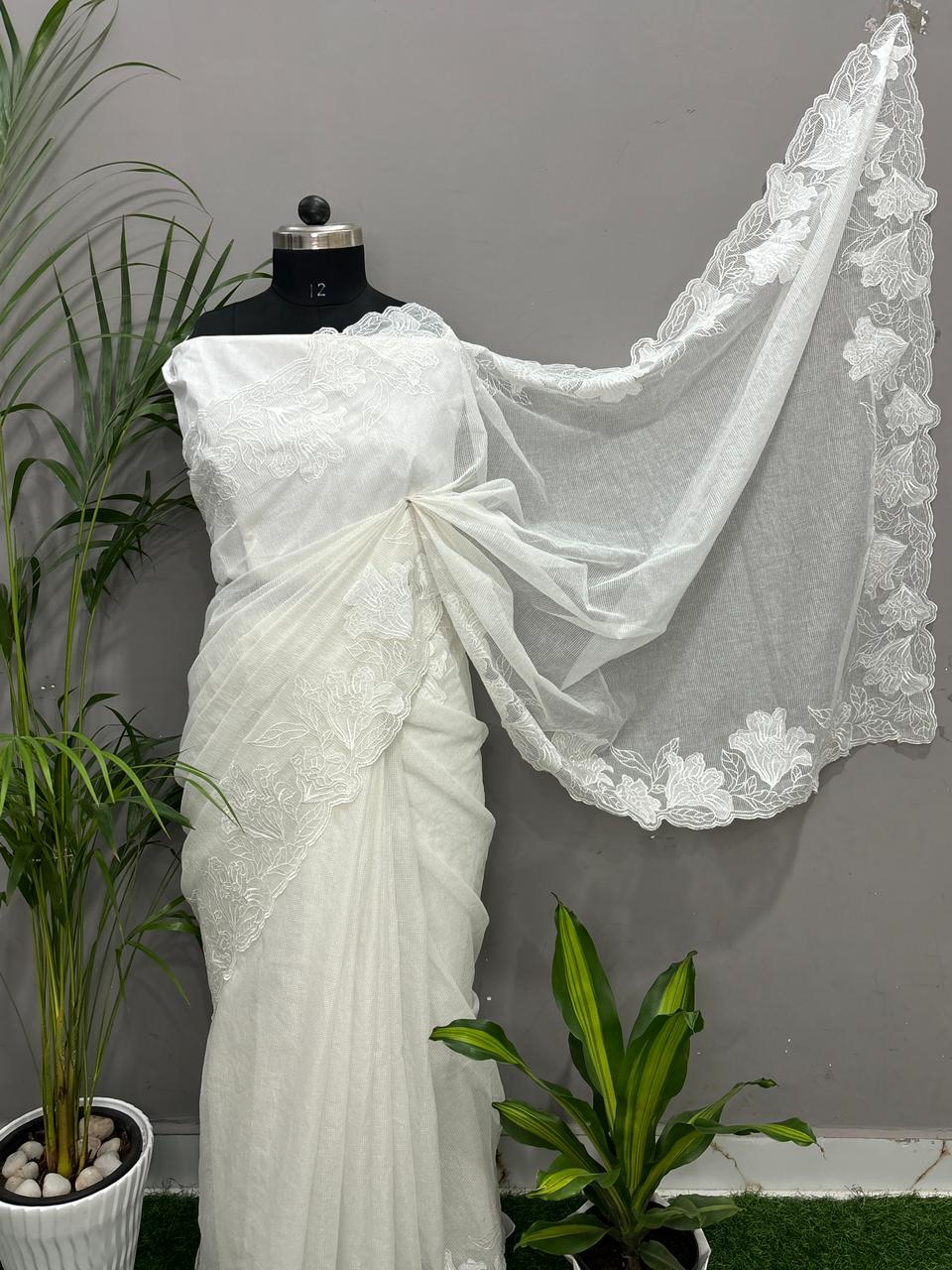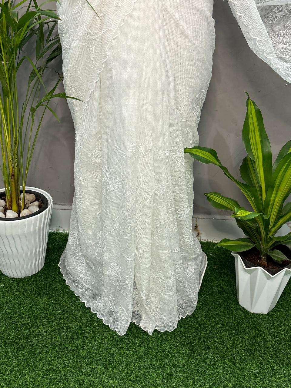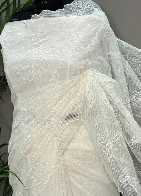 This saree is made of lightweight Moonga check cotton in a pure white shade. It features hand-done floral embroidery work. Suitable for daily wear, church, festive use, office wear, and gifting.