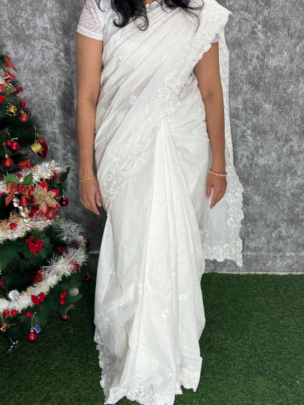 White Organdy Saree with Floral Embroidery Work